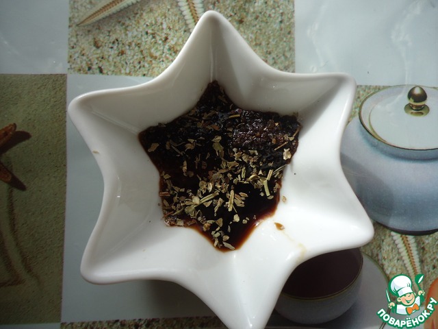Можно приготовить смесь с соевым соусом, добавив в него сахар и прованские травы, но удобнее смазать сначала дольки соевым соусом, а затем посыпать сухой смесью из сахара и прованских трав.