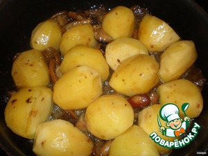 Картофель очистить, разрезать на половинки, немного обжарить вместе с грибами.