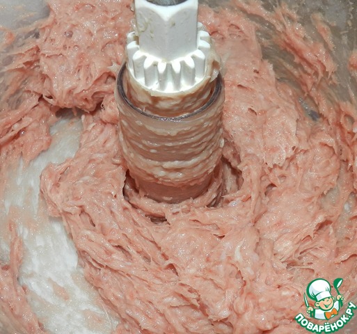 Когда мясо достаточно охладиться, достаем фарш, закладываем его в комбайн, заливаем ледяную воду, добавляем соль 20 г. (10 нитритной+10 поваренной) и вмешиваем до состояния эмульсии, ну или близкого к ней. И обязательно следим, за тем, что бы в процессе наша эмульсия не согрелась выше 12 гр. С - это важно! Сразу оговорюсь, поберегите свою технику и не закладывайте весь фарш, я делила на 4 части, пока одна смешивалась, другие ждали в морозилке!