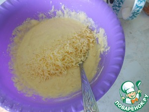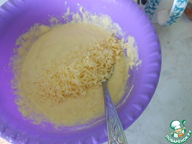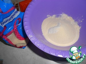 Соединить в миске сыпучие продукты-муку, манную крупу, разрыхлитель, соль, перемешать.