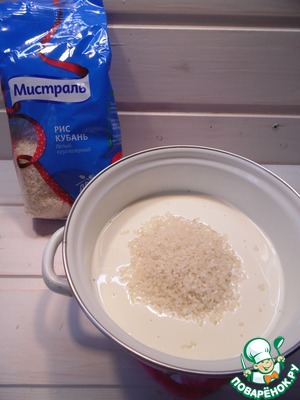 Молоко соединить со сливками, всыпать рис и сахар, варить на медленном огне до готовности (35-40 минут).