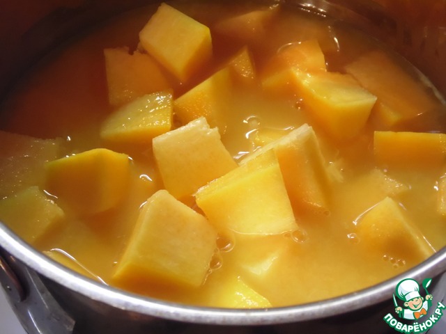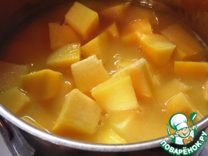 Пока варится каша, займемся соусом. Тыкву нарезать небольшими кубиками, залить апельсиновым соком, варить 10 минут.