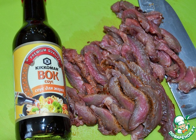 Перед приготовлением за 1 час достать мясо, нарезать на тонкие полоски.