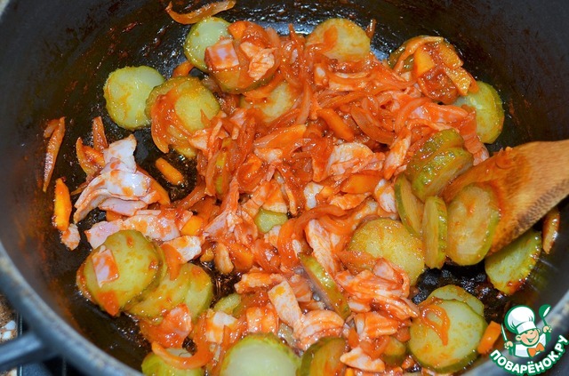Нарезать очищенную тыкву мелко, добавить к луку. Обжарить до прозрачности лука, влить томатный соус. Массу обжаривать 5 минут.