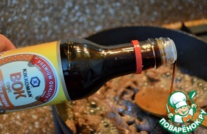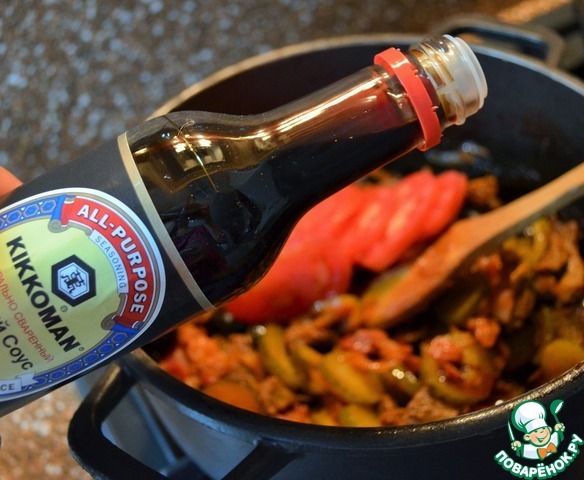 Влить 2 ст. л. натурально сваренного соевого соуса от ТМ Киккоман. Обжарить 3 минуты.