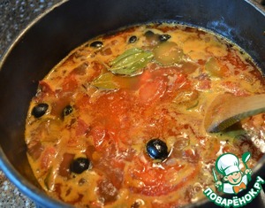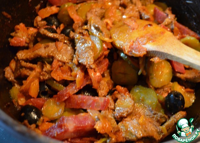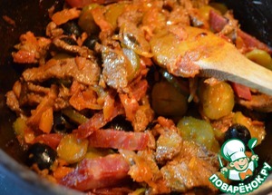 Добавить в казан маслины без косточек, тушить пару минут, помешивая.