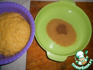 Тесто наше подошло. Для начинки в другой миске соединить тростниковый сахар с корицей.