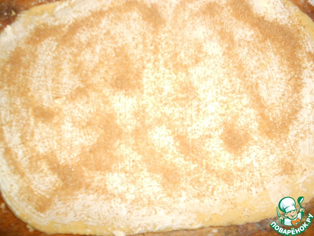 Подошедшее тесто раскатать в пласт размером примерно 20 на 30 см. Смазать размягченным сливочным маслом, посыпать смесью корицы и сахара.