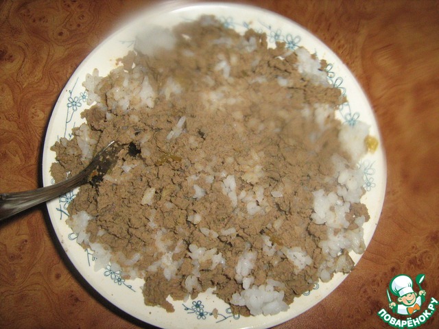 Смешать рис с перекрученной печенью.