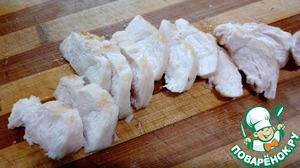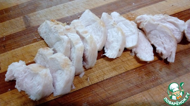 Куриное филе обжарить на растительном масле под крышкой по 2-3 минуты с каждой стороны. Остудить, нарезать ломтиками.