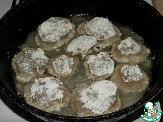 Каждую шляпку обвалять хорошенько в муке и обжарить на растительном масле с обеих сторон, до золотистой корочки. -