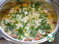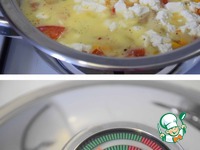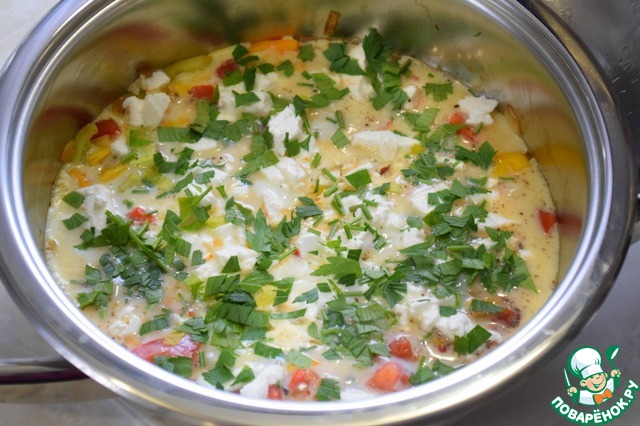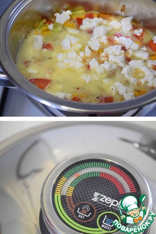 Добавляем раскрошенную брынзу, выливаем взбитые яйца, закрываем крышкой и на среднем огне доводим стрелку до середины зеленой шкалы (у меня ушло 1-2 мин.), снимаем сотейник с огня и оставляем наше блюдо "доходить" минут на 5. |