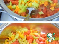 Добавляем порезанный болгарский перец. Перемешиваем. Закрываем крышкой и готовим 1 мин. |