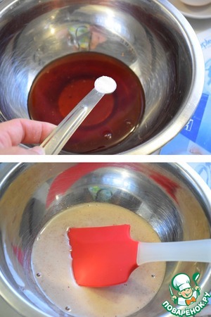 Добавляем фруктозу, яйцо, вливаем чай, добавляем корицу и перемешиваем.