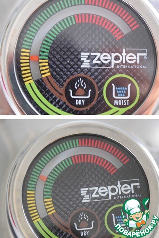 Закрываем сотейник крышкой, на среднем огне доводим стрелку термоконтроллера до начала зеленого сектора (следим по внутренней шкале). Затем огонь уменьшаем до минимального, доводим стрелку термоконтроллера до середины зеленого сектора (у меня на это ушло 15 мин.), отключаем огонь и оставляем нашу выпечку еще на 10 мин. под крышкой.