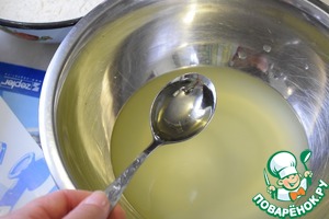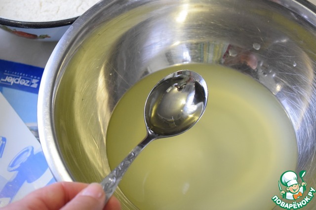 В миску вылить сыворотку, добавить соду и фруктозу. Перемешать. Добавить растительное масло. Перемешать.