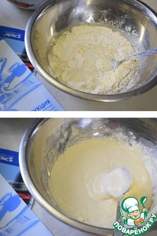 Добавить два вида просеянно муки и замесить тесто (как на оладьи).