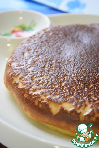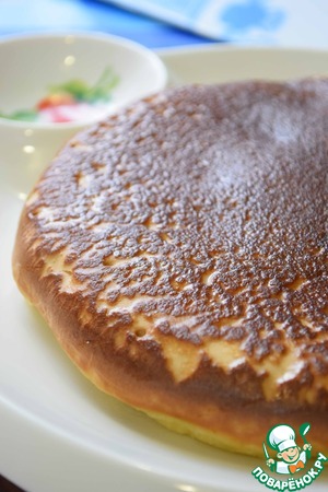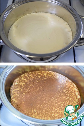 Сотейник ничем не смазываем, тесто не прилипает. Выливаем наше тесто, закрываем сотейник крышкой и жарим пышку 5 мин. Затем переворачиваем пышку на вторую сторону, закрываем крышкой и жарим еще 5 мин. Если стрелка термоконтроллера дошла до середины зеленого сектора, огонь отключаем, а сотейник переносим на холодную конфорку.