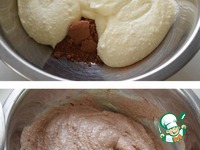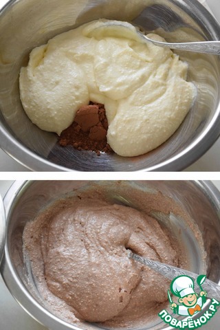 Разделить тесто на 2 равные части. В одну добавить какао и хорошо перемешать.