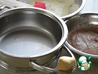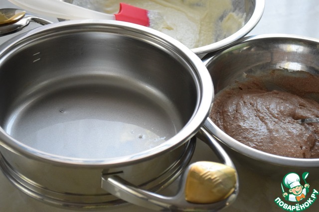 Выкладываем на дно сотейника попеременно столовую ложку светлого и столовую ложку темного теста и т. д., пока тесто не закончится. |