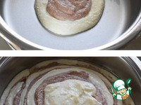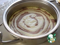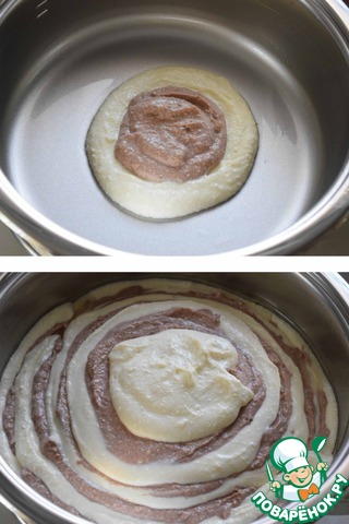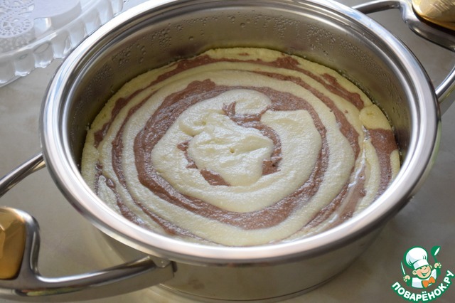 Выкладываем на дно сотейника попеременно столовую ложку светлого и столовую ложку темного теста и т. д., пока тесто не закончится.
