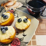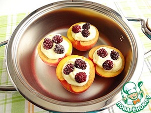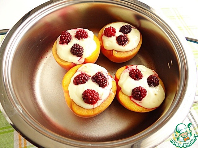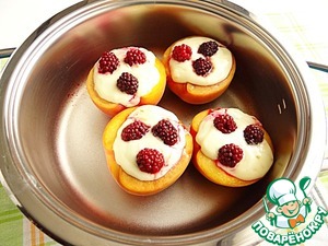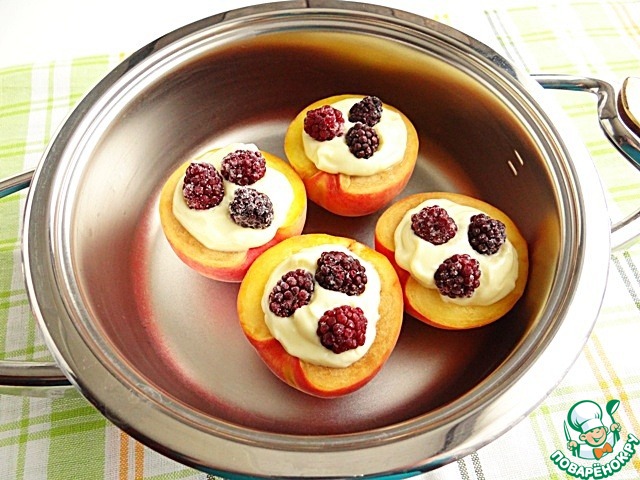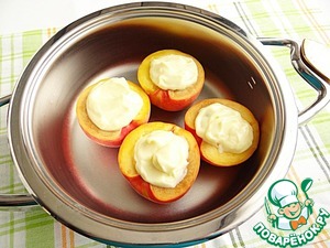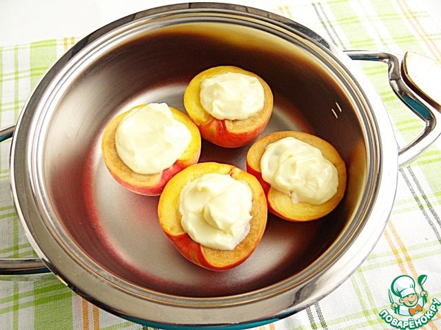 Выкладываю половинки персиков в сотейник Zepter срезом вверх. На каждую половинку персика выкладываю 1/4 часть крема.