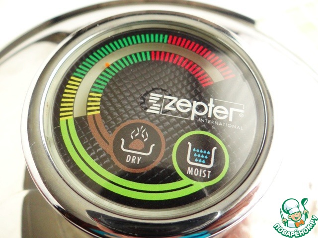 Сотейник закрываю крышкой и кладу на холодную плиту, включаю на самый маленький огонь (у моей электроплиты на переключателе 4 деления, поэтому я включаю на единицу). Даю стрелке термоконтроллера дойти до середины зеленого поля, затем отключаю плиту.