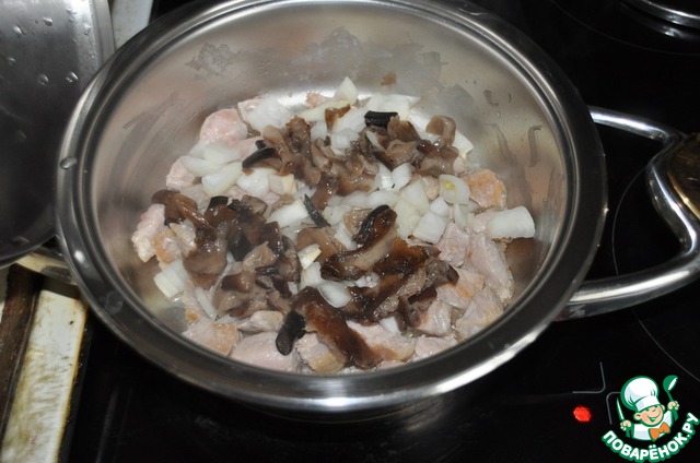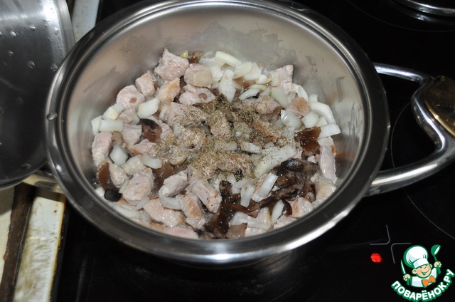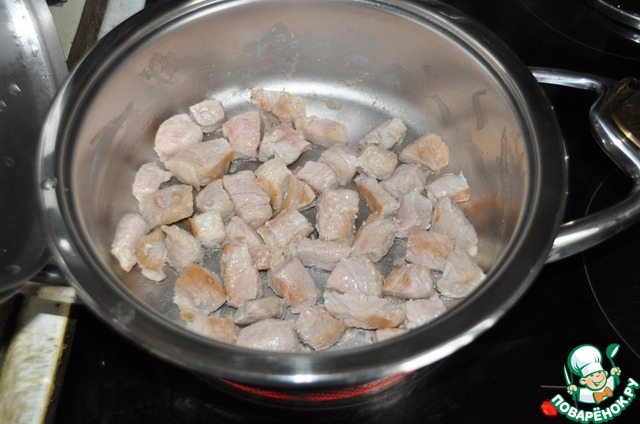Свинину режем небольшими кубиками и кладём на дно сотейника, слегка придавливаем.