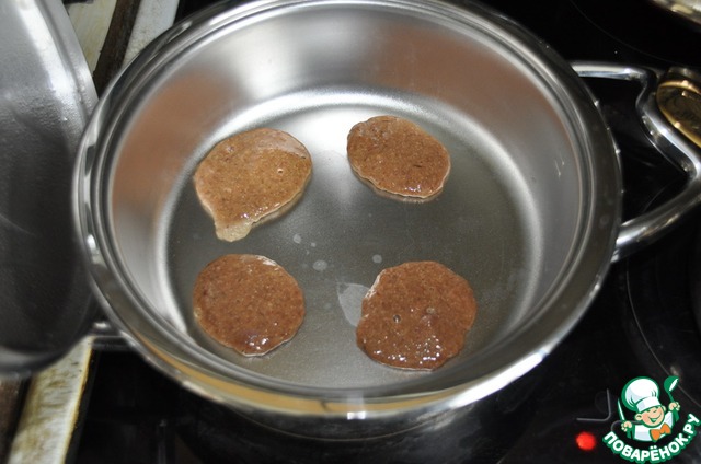 Кладём столовой ложкой печёночное "тесто". Масло при жарке оладий в Zepter не требуется. Выдерживаем оладьи при открытой крышке 2 минуты, переворачиваем. При работе в посуде Zepter можно использовать металлические лопатки, они не царапают дно. Убираем огонь до минимального.