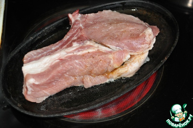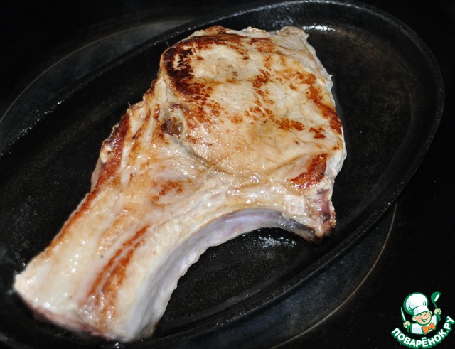 • Обжариваем мясо до румяности на большом огне с обеих сторон. Удобнее брать сковороду, в которой будете далее запекать мясо.