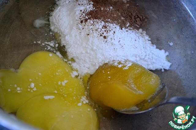 Смешиваем все - яйца, мед, корицу, разрыхлитель, рисовую муку. Получается достаточно жидкое и липкое тесто.