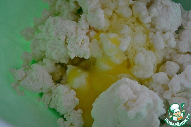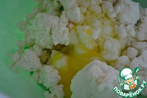 Перетираем творог с яйцами, кладем муку, разрыхлитель, вымешиваем.