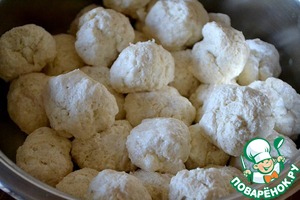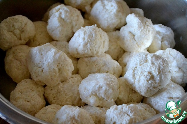 Мокрыми руками формируем шарики и кладем их в кастрюлю, на дно которой вылит стакан сметаны.