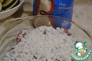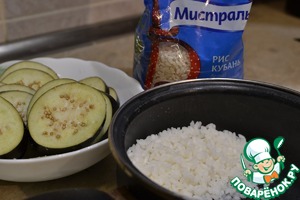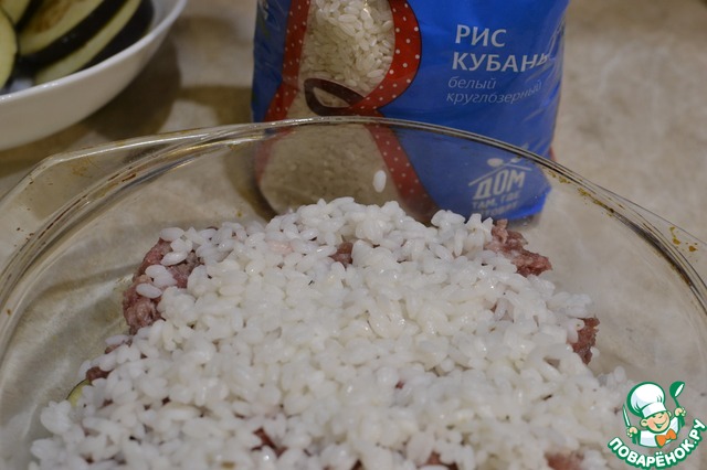 На дно смазанной растительным маслом формы укладываем слой баклажан так, что бы закрыли дно. не страшно, если где-то они будут в один слой, а где то в два слоя. Не забудем оставить баклажаны для верхушки пирога. Поверх баклажанов распределяем соленый и перченый по вкусу сырой фарш, затем рис.