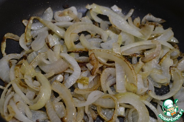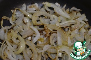 Режем лук кольцами и жарим на растительном масле до красивого золотистого цвета