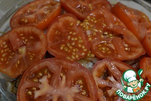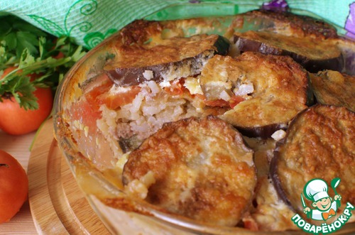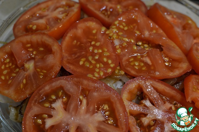 Поверх риса выкладываем жареный лук, затем нарезанные кружочками подсоленные помидоры, накрываем помидоры оставшимися баклажанами.