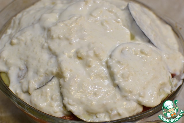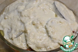 Готовим заливку- измельченный сыр смешиваем со сметаной и майонезом. ( я делаю это в измельчителе). Заливка должна быть густой. Равномерно намазываем заливкой баклажаны.