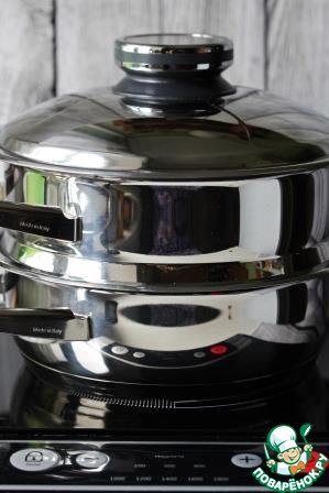• Поставить форму в пароварку (пароварку установить на сотейник, в котором приготовить другое блюдо), закрыть крышкой и поставить на плиту.