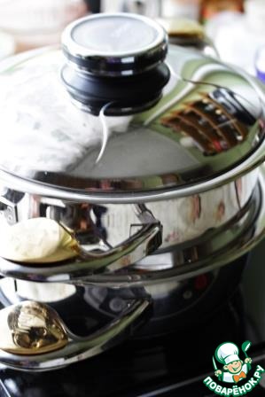 Установить пароварку на сотейник (в нем я готовила в это время свеклу), закрыть крышкой и поставить на плиту.