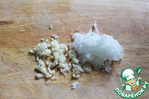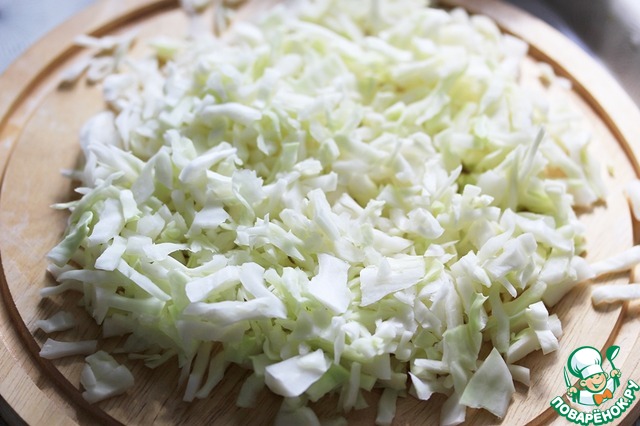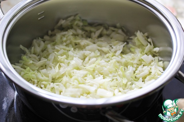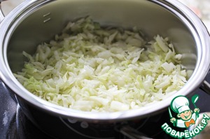 Смешать капусту с луком и чесноком, выложить в сотейник.