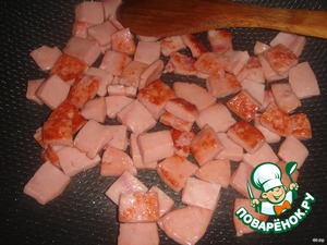 Обжарьте в сковороде на растительном масле порезанную кубиками ветчину в течение 2-3 минут. Выложите из сковороды и отставьте.
