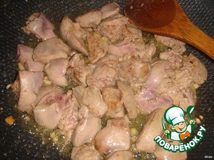 Обжарьте в этой же сковороде мелко порубленный чеснок 1-2 минуты, добавьте сливочное масло и обжарьте порезанную кусочками куриную печень. Печень нужно жарить 3-4 минуты.