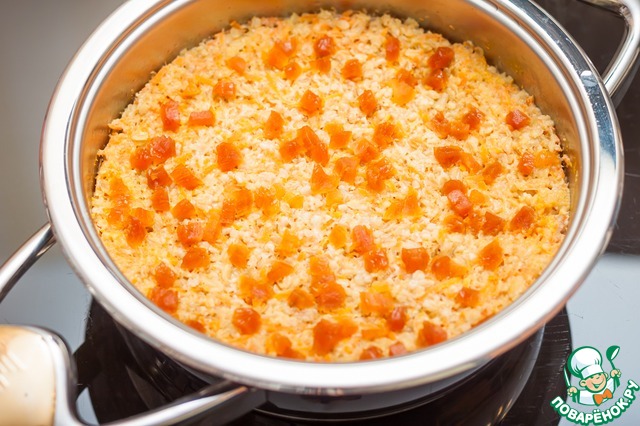 Вылить в сотейник Zepter, поверхность посыпать нарезанной курагой или изюмом