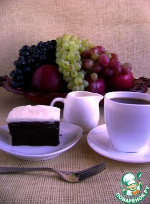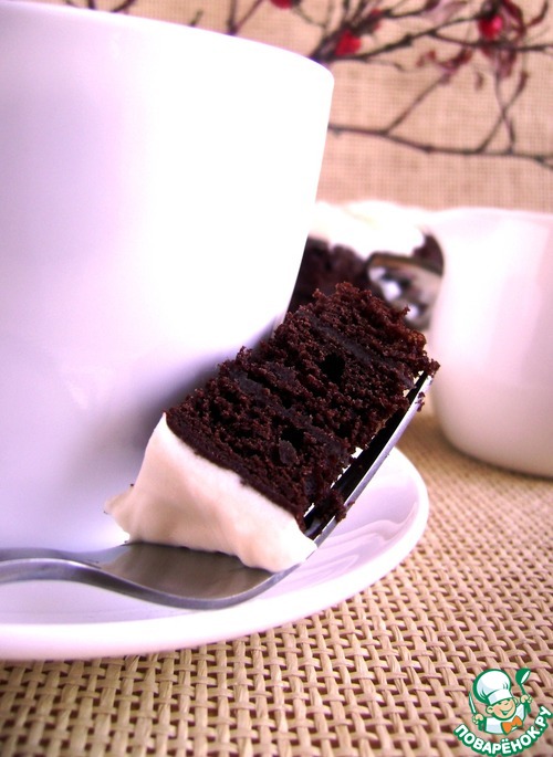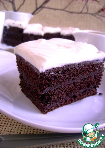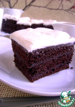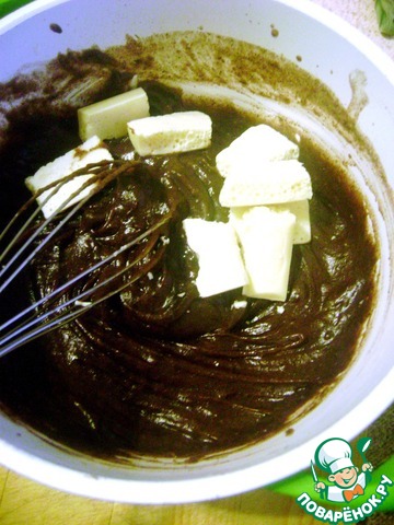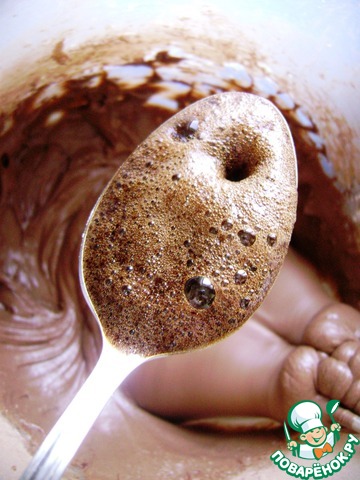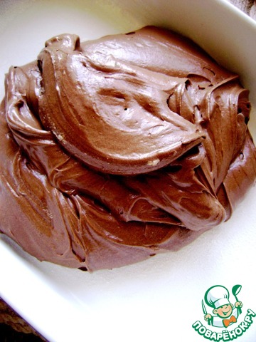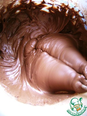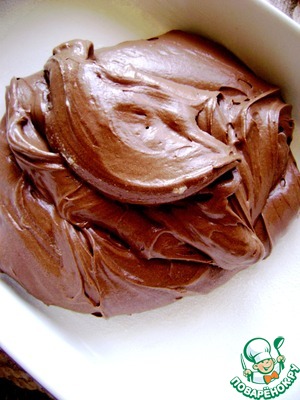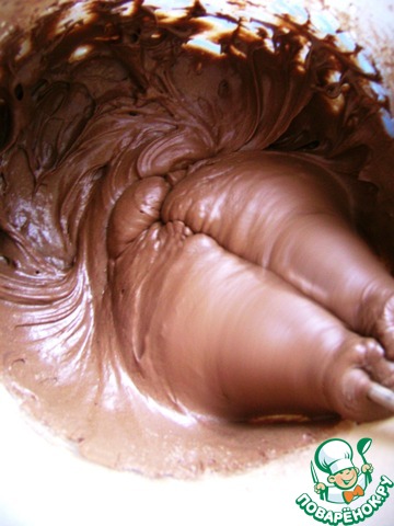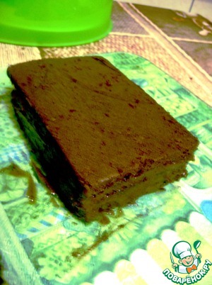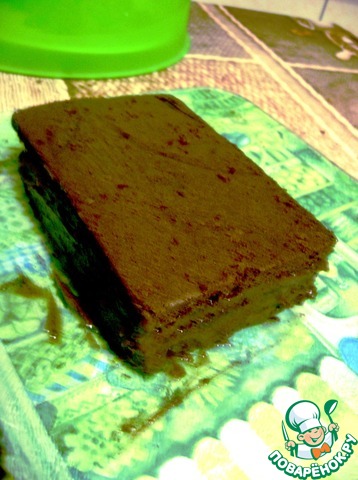 Смесь станет светлее и будет напоминать шоколадный крем. Выложить тесто в застеленную пергаментом форму –лучше прямоугольную и выпекать в разогретой до 200 градусов духовке 15 минут. Затем снизить нагрев до 160 и допекать до сухой лучинки. Готовый корж охладить в форме, затем аккуратно вынуть, снять с пергамента и плотно завернуть в пленку. Убрать в холодильник на ночь или дольше. У меня лежал 2 дня.