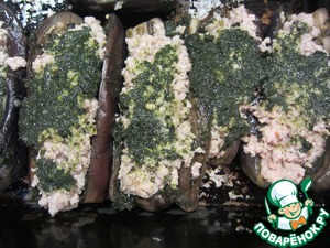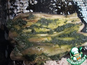 Остывший баклажан разрезаем и смазываем пастой из зелени и чеснока