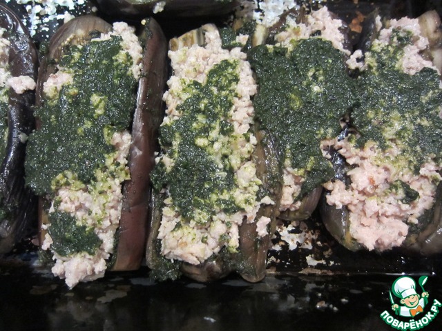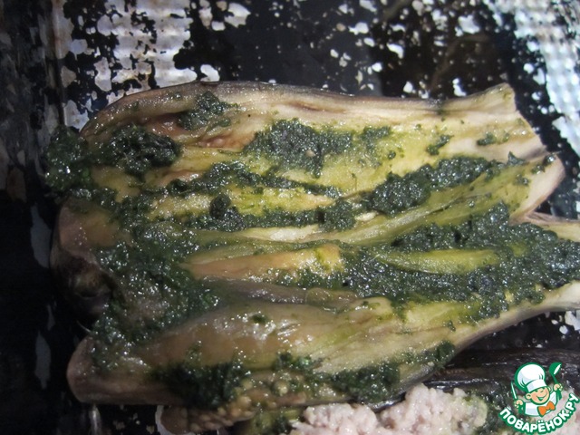 Укладываем в форму или на противень смазанный 1ст. л раст масла, на баклажан жареный фарш сверху я доложила зеленую пасту ее у меня много осталось