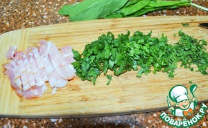 Нарезать мелко вымытую и обсушенную зелень, бекон.