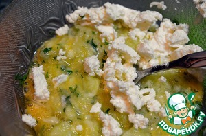 Муку просеять и добавить, покрошить брынзу.