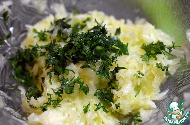 Кабачок натереть на крупной терке, положить в дуршлак и присыпать солью. Дать постоять 20 минут. Отжать всю лишнюю жидкость.
