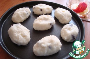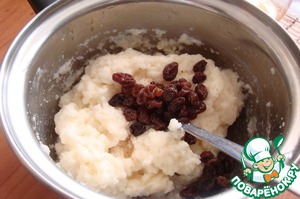 Изюм заливаем кипятком и даём набухнуть. Отправляем в кашу.